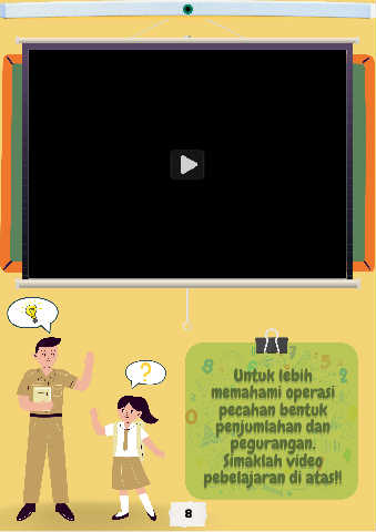 Untuk lebih Untuk lebih memahami operasi memahami operasi pecahan bentuk pecahan bentuk penjumlahan dan penjumlahan dan pegurangan. pegurangan. Simaklah video Simaklah video pebelajaran di atas!! pebelajaran di atas!! 8