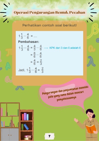 Operasi Pengurangan Bentuk Pecahan Perhatikan contoh soal berikut! Pengurangan dan penjumlahan memiliki pola yang sama dalam mencari penyelesaiannya 7