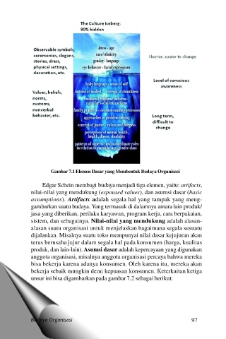 Edgar Schein membagi budaya menjadi tiga elemen, yaitu: artifacts,