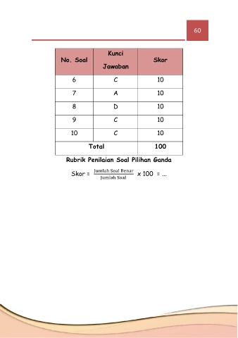 60 Kunci No. Soal Skor Jawaban 6 C 10 7 A 10 8 D 10 9 C 10 10 C 10 Total 100 Rubrik Penilaian Soal Pilihan Ganda Skor = x 100 = ...