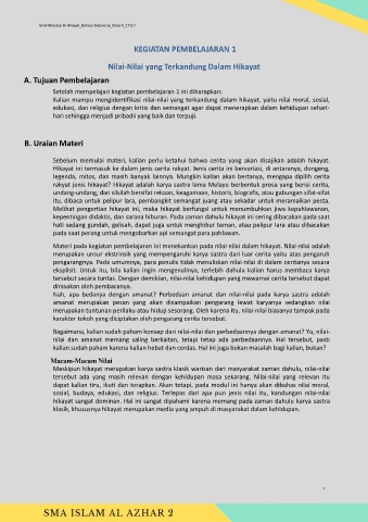 Materi pada kegiatan pembelajaran ini menekankan pada nilai-nilai dalam hikayat. Nilai-nilai adalah