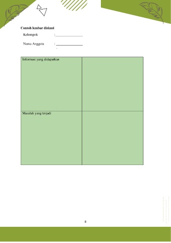 Contoh lembar diskusi Kelompok : Nama Anggota : Informasi yang didapatkan Masalah yang terjadi 8