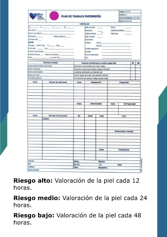 Riesgo alto: Valoración de la piel cada 12 horas. Riesgo medio: Valoración de la piel cada 24 horas. Riesgo bajo: Valoración de la piel cada 48 horas.