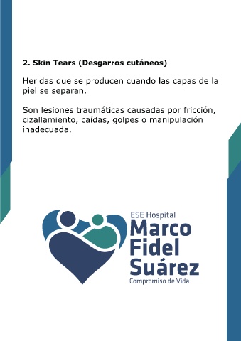 2. Skin Tears (Desgarros cutáneos) Heridas que se producen cuando las capas de la piel se separan. Son lesiones traumáticas causadas por fricción, cizallamiento, caídas, golpes o manipulación inadecuada.