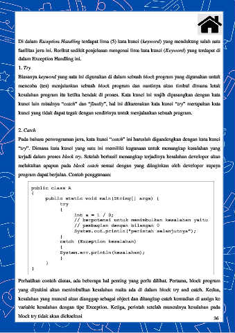 Di dalam Exception Handling terdapat lima (5) kata kunci (keyword) yang mendukung salah satu