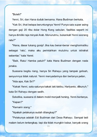 Seketika, suasana di dalam mobil menjadi hening. Yenni bertanya,