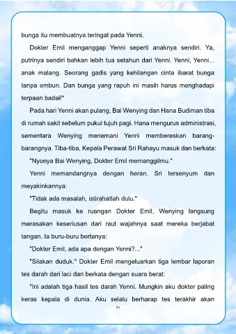 "Silakan duduk." Dokter Emil mengeluarkan tiga lembar laporan