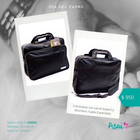 D Í A D E L P A D R E $ 950 3 divisiones con cierre trasero y Maletin MAL10 OWEN delantero. Fuelle Expansible. Medidas: 30 x 40 cm. Material: Cordura