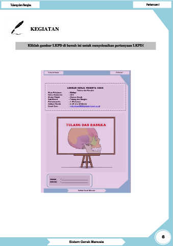 Tulang dan Rangka Pertemuan 1 Pertemuan 1 Tulang dan Rangka KEGIATAN Kliklah gambar LKPD di bawah ini untuk menyelesaikan pertanyaan LKPD! 9 6 Sistem Gerak Manusia Sistem Gerak Manusia