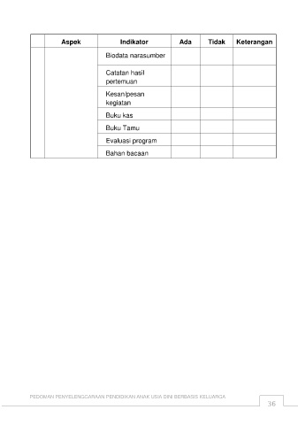 o Aspek Indikator Ada Tidak Keterangan Biodata narasumber Catatan hasil pertemuan Kesan/pesan kegiatan Buku kas Buku Tamu Evaluasi program Bahan bacaan PEDOMAN PENYELENGGARAAN PENDIDIKAN ANAK USIA DINI BERBASIS KELUARGA 36