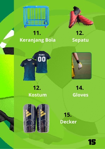 11. 12. Keranjang Bola Sepatu 12. 14. Kostum Gloves 15. Decker 15