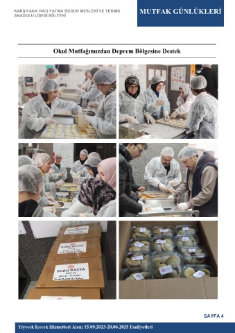KARŞIYAKA HACI FATMA BODUR MESLEKİ VE TEKNİK MUTFAK GÜNLÜKLERİ ANADOLU LİSESİ BÜLTENİ Okul Mutfağımızdan Deprem Bölgesine Destek SAYFA 4 Yiyecek İçecek Hizmetleri Alanı 15.09.2023-20.06.2025 Faaliyetleri