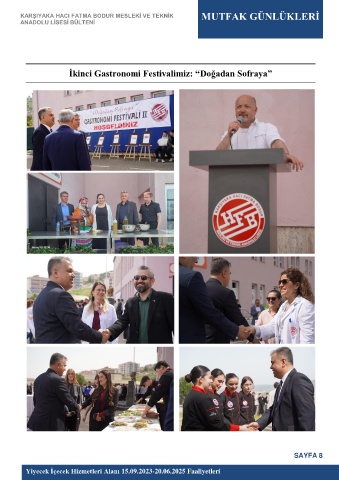 KARŞIYAKA HACI FATMA BODUR MESLEKİ VE TEKNİK MUTFAK GÜNLÜKLERİ ANADOLU LİSESİ BÜLTENİ İkinci Gastronomi Festivalimiz: “Doğadan Sofraya” SAYFA 8 Yiyecek İçecek Hizmetleri Alanı 15.09.2023-20.06.2025 Faaliyetleri