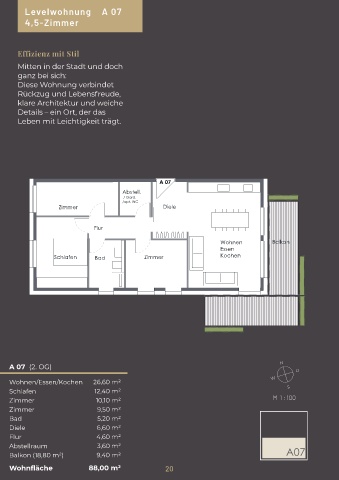 Schlafen Schlafen 14,4 m² Schlafen 10,6 m² Wohnen 22,6 m² 10,0 m² 10,0 m² B07 B07 Wohnfläche 41,4 m² Maßstab 1 I 100