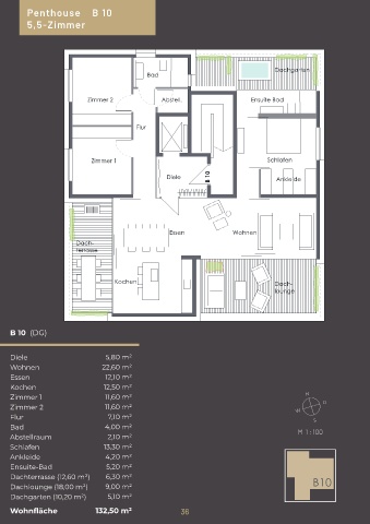 Diele Dachlounge (18,00 m²) Dachlgarten (10,2 m²)6,3 Maßstab 1 m² Wohnfläche 132,5 m² Maßstab 1 I 100 Maßstab 1 I 100