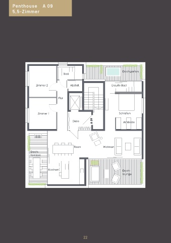 Essen              Bad      12,1  m²   Zimmer   5,5 Dach- m² Bad         m² O         5,5   m²                   Ankleide    A08  Zimmer 2          m²  Wohnfläche     m²            88,0  m²