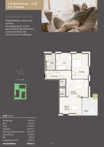 Wohnen/Essen/Kochen 30,70 m² Schlafen 14,40 m²
