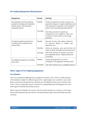 Fire detection and fire warning Weekly Check all systems for state of repair and