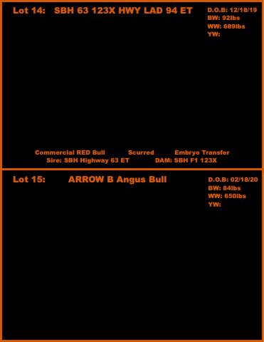 Lot 14: SBH 63 123X HWY LAD 94 ET D.O.B: 12/18/19 BW: 92lbs WW: 689lbs YW: Commercial RED Bull Scurred Embryo Transfer Sire: SBH Highway 63 ET DAM: SBH F1 123X Lot 15: ARROW B Angus Bull D.O.B: 02/18/20 BW: 84lbs WW: 650lbs YW: