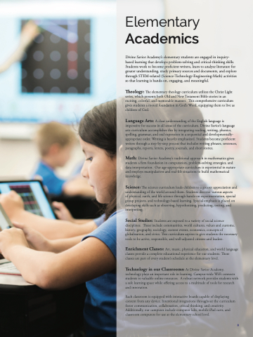 Technology in our Classrooms: At Divine Savior Academy, technology plays an important role in learning. Campus-wide WiFi connects students to valuable online resources. A robust network provides students with a safe learning space while offering access to a multitude of tools for research and innovation.
