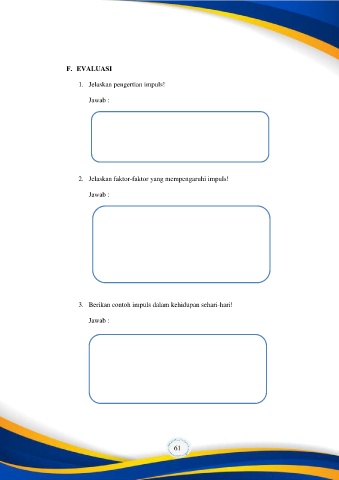 F. EVALUASI 1. Jelaskan pengertian impuls! Jawab : 2. Jelaskan faktor-faktor yang mempengaruhi impuls! Jawab : 3. Berikan contoh impuls dalam kehidupan sehari-hari! Jawab : 61