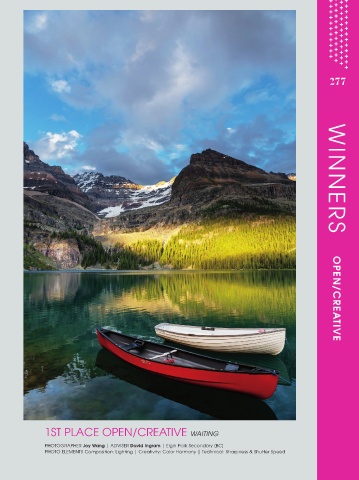 277 WINNERS 1ST PLACE OPEN/CREATIVE WAITING OPEN/CREATIVE PHOTOGRAPHER Joy Wang | ADVISER David Ingram | Elgin Park Secondary [BC] PHOTO ELEMENTS Composition: Lighting | Creativity: Color Harmony | Technical: Sharpness & Shutter Speed