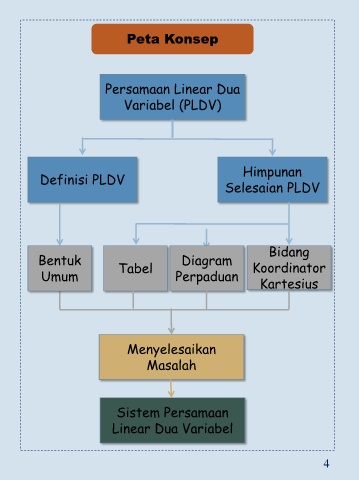 Peta Konsep Persamaan Linear Dua Variabel (PLDV) Himpunan Definisi PLDV Selesaian PLDV Bidang Bentuk Tabel Diagram Koordinator Umum Perpaduan Kartesius Menyelesaikan Masalah Sistem Persamaan Linear Dua Variabel 4