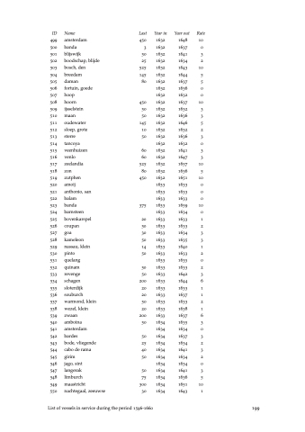 ID Name Last taiwan Year in Year out Rate ulysses urk venenburg vink vogelzang wachter wakende boei zeeridder amsterdam, klein arke noë caliture cruz, st elburg formosa geelmuiden hasselt hert, vliegende hiettoe jacatra japara japara kaneelschiller krab leeuwin lootsboot, grote lootsboot, kleine mannaar maria massulipatnam mees mozambique narsepouer otter ouglij patientie postillion romain sillida snoek spijt den duijvel spreeuw waterpas zeeblom bantam breskens colombo goeree harp hert, rode hoogland immenhorn Dutch Ships in Tropical Waters