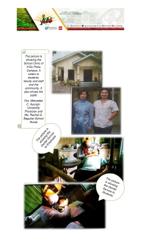 The picture is showing the School Clinic of IFSU Potia Campus. It caters to students, faculty and staff and the community. It also shows the staffs Dra. Mercedes C. Ayungo- University Physician and Ms. Rachel G. Baguilat-School Nurse