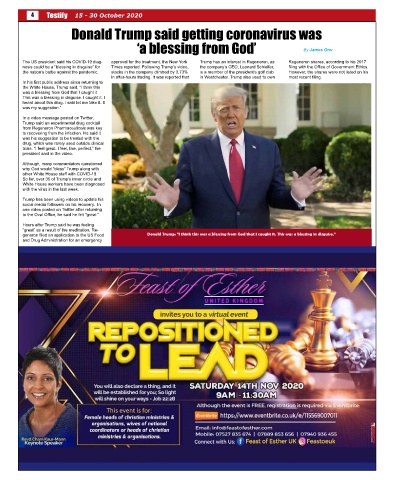 The US president said his COVID-19 diag- approval for the treatment, the New York Trump has an interest in Regeneron, as Regeneron shares, according to his 2017