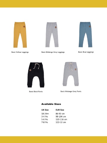 Basic Yellow Leggings Basic Melange Grey Leggings Basic Blue Leggings Basic Black Pants Basic Melange Grey Pants Available Sizes UK Size EUR Size 18-24m 86-92 cm 3-4 Yrs 98-104 cm 5-6 Yrs 110-116 cm 7-8 Yrs 122-12 cm