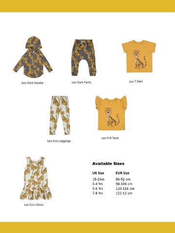 Leo Dark Hoodie Leo Dark Pants Leo T Shirt Leo Frill Tank Leo Ecru Leggings Available Sizes UK Size EUR Size 18-24m 86-92 cm 3-4 Yrs 98-104 cm 5-6 Yrs 110-116 cm 7-8 Yrs 122-12 cm Leo Ecru Dress