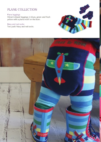PLANE COLLECTION Plane leggings Vibrant striped leggings in blues, green and fresh yellow with a plane motif on the bum. Navy and red socks Two pack: Navy and red socks. 45 23