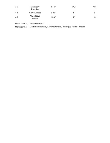 35 McKinley 5' 4'' PG 10 Peoples 44 Katye Jones 5' 10'' F 9 Allen Kaye 45 5' 8'' F 10 Wilcox Head Coach: Amanda Hatch Manager(s): Caitlin McDonald, Lily McDonald, Tori Pigg, Parker Woods