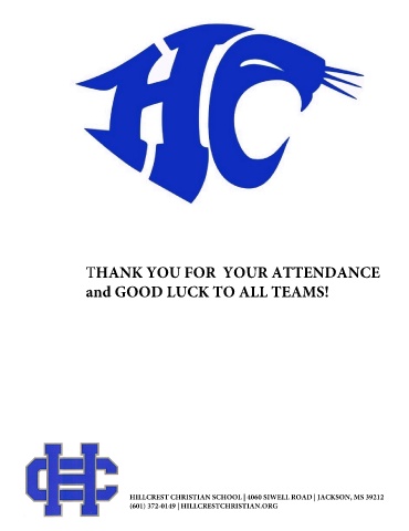 THANK YOU FOR YOUR ATTENDANCE and GOOD LUCK TO ALL TEAMS! HILLCREST CHRISTIAN SCHOOL | 4060 SIWELL ROAD | JACKSON, MS 39212 (601) 372-0149 | HILLCRESTCHRISTIAN.ORG