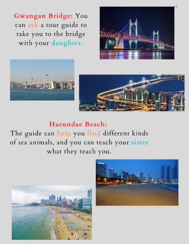 •7 Gwangan Bridge: You can ask a tour guide to take you to the bridge with your daughter. Haeundae Beach: The guide can help you find different kinds of sea animals, and you can teach your sister what they teach you.