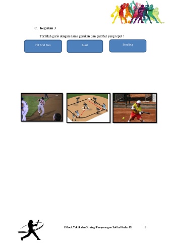 C. Kegiatan 3 Tariklah garis dengan nama gerakan dan gambar yang tepat ! Hit And Run Bunt Stealing E-Book Taktik dan Strategi Penyerangan Softball kelas XII 11
