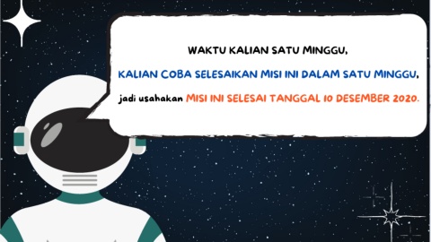 WAKTU KALIAN SATU MINGGU, KALIAN COBA SELESAIKAN MISI INI DALAM SATU MINGGU, jadi usahakan MISI INI SELESAI TANGGAL 10 DESEMBER 2020.