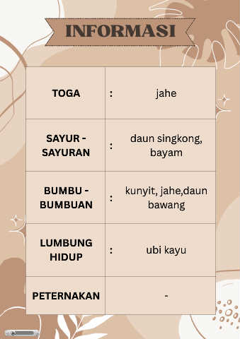 INFORMASI TOGA : jahe SAYUR - daun singkong, SAYURAN : bayam BUMBU - kunyit, jahe,daun BUMBUAN : bawang LUMBUNG : ubi kayu HIDUP PETERNAKAN -