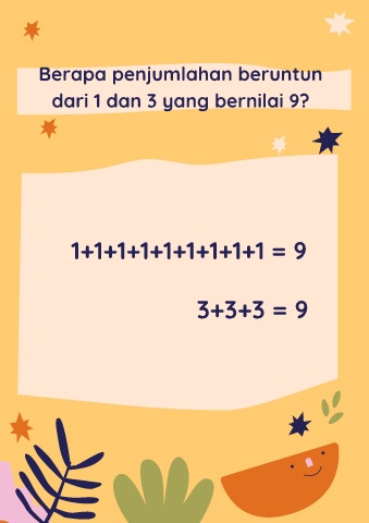 Berapa penjumlahan beruntun dari 1 dan 3 yang bernilai 9? 1+1+1+1+1+1+1+1+1 = 9 3+3+3 = 9