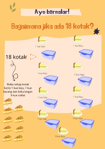 Bagaimana jika ada 18 kotak? Ayo bernalar! 1 kue keju 1 kue keju 18 kotak 1 kue keju 1 kue keju Maka setiap kotak berisi 1 kue keju, 1 kue kacang dan kekurangan 9 kue coklat 1 kue keju 1 kue keju 1 kue keju 1 kue keju 1 kue keju