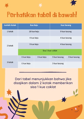 Perhatikan tabel di bawah! Dari tabel menunjukkan bahwa jika disajikan dalam 2 kotak memberikan sisa 1 kue coklat