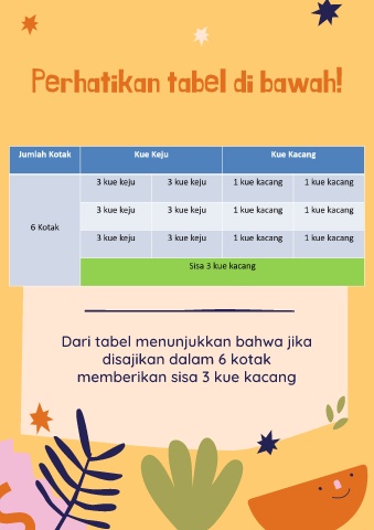 Perhatikan tabel di bawah! Dari tabel menunjukkan bahwa jika disajikan dalam 6 kotak memberikan sisa 3 kue kacang