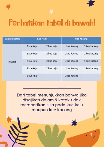Perhatikan tabel di bawah! Dari tabel menunjukkan bahwa jika disajikan dalam 9 kotak tidak memberikan sisa pada kue keju maupun kue kacang