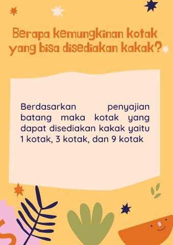 Berapa kemungkinan kotak yang bisa disediakan kakak? Berdasarkan penyajian batang maka kotak yang dapat disediakan kakak yaitu 1 kotak, 3 kotak, dan 9 kotak