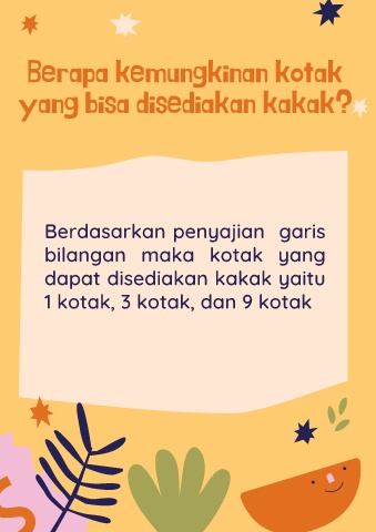Berapa kemungkinan kotak yang bisa disediakan kakak? Berdasarkan penyajian garis bilangan maka kotak yang dapat disediakan kakak yaitu 1 kotak, 3 kotak, dan 9 kotak
