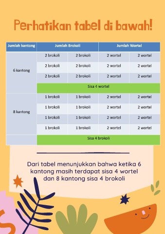Perhatikan tabel di bawah! Dari tabel menunjukkan bahwa ketika 6 kantong masih terdapat sisa 4 wortel dan 8 kantong sisa 4 brokoli