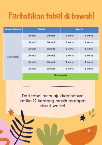 Perhatikan tabel di bawah! Dari tabel menunjukkan bahwa ketika 12 kantong masih terdapat sisa 4 wortel