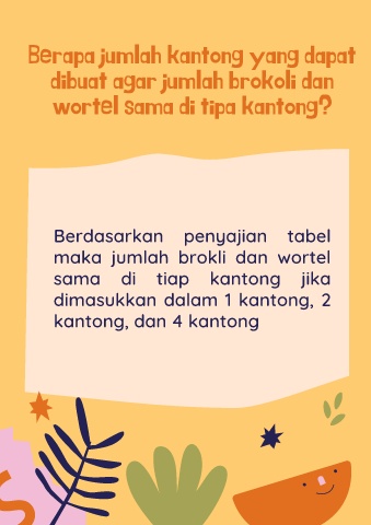 Berapa jumlah kantong yang dapat dibuat agar jumlah brokoli dan wortel sama di tipa kantong? Berdasarkan penyajian tabel maka jumlah brokli dan wortel sama di tiap kantong jika dimasukkan dalam 1 kantong, 2 kantong, dan 4 kantong