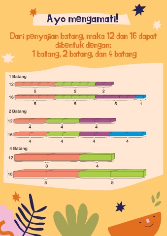 Ayo mengamati! Dari penyajian batang, maka 12 dan 16 dapat dibentuk dengan: 1 batang, 2 batang, dan 4 batang
